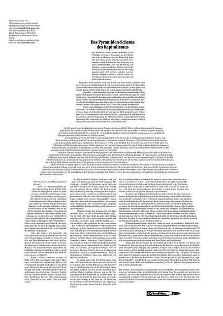 Die Arbeit der weiter unten Stehenden in der Pyramide bereichert diejenigen an der Spitze. Um stabil zu bleiben, muss die Wirtschaft mehr und mehr Ressourcen absorbieren: durch kolonisieren neuer Kontinente, den Einbezug von mehr Arbeitskräften oder die Eroberung von Aspekten unseres täglichen Lebens. Die resultierenden Ungleichheiten können nur mit stetig eskalierender Kraft aufrecht erhalten werden.